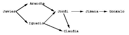 Figura 3-1 muestra un anillo de confianza cuyo origen está en Javier. El gráfico ilustra quién ha firmado las claves de quién. La tabla muestra qué claves son consideradas válidas por Javier en base a su confianza en otros miembros del anillo. Este ejemplo asume que se necesitan dos claves de confianza marginal o una de confianza plena para validar otra clave. La longitud máxima del camino es tres.